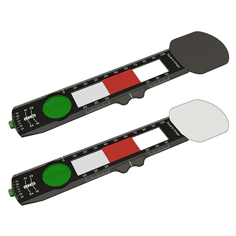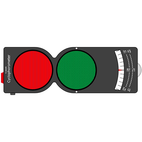左右の眼の回旋(回転)の程度を調べるマニュアル検査です。内斜視・外斜視・上斜視・下斜視と異なり、回旋斜視は見た目では程度がわかりにくく、特殊な器具を使用して計測します。回旋斜視は、真正面から眼を見た状態で、眼が時計回り又は反時計回りに回転してしまっている状態の斜視です。回旋斜視では、見えているものは同じでも像自体に傾き(回転)が生じます。この現象を利用して、左右それぞれ異なるものを見て、その像を合体(融像)させて傾きの差を計測します。