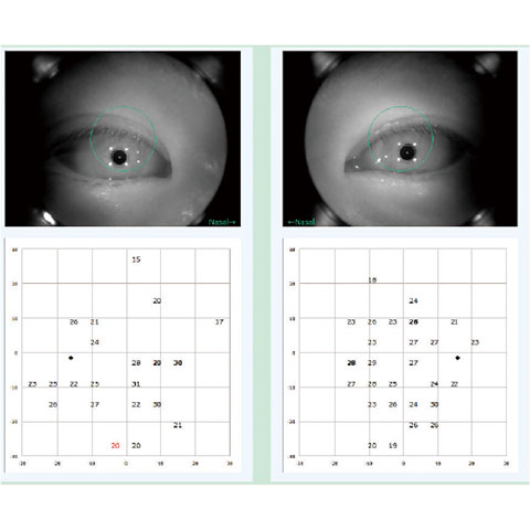 | 測定時間 | 5~10分程度 視野に異常がない場合は短時間で終了しますが、異常がみられる場合には器械側あが確認動作を行うため相対的に検査時間は長くなります。 |