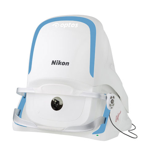 網膜の表面を超広角レンズを用いて、通常のレンズより広い範囲を撮影し観察する検査です。通常、眼の奥は、目薬で瞳を広げないと(散瞳)観察しにくい場所です。瞳は、眼を外から観察するための「窓」であるため、窓が小さい状態だと内側の見える部分が限られてしまいます。当検査機器では超広角レンズを用いており、無散瞳状態でも通常のレンズの8倍程度、眼底の80%もの範囲を一度で撮影することが可能です。網膜(眼底)は、人体では唯一、血管をほぼ直接的に観察できる場所です。網膜はもともと非常に薄い膜であることから、網膜層の血管だけでなく、網膜の外側の脈絡膜の血管まで観察することが可能です。最も浅い部分にある血管では血管壁が網膜の表面の壁と一体化している場合もあります。血管壁は、その状態によっては光を当てると見え方(色・反射等)が異なります。これらの見え方によって異常を推測することが可能です。また、血管からの出血、血管の狭窄(血管が細く狭くなること)、血管の閉塞(血管が詰まってしまっていること)、漿液(血管から水分が漏れ出ていること)、新生血管(血管が詰まることで、周辺部が低栄養となって新たに血管が生じたもの。新生血管は非常に脆く出血を伴いやすい。)等の観察が可能です。網膜の血管の観察は、眼の病気だけでなく、全身的な病気の発見にもつながりますので、非常に重要な検査です。