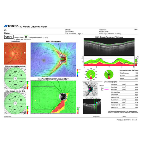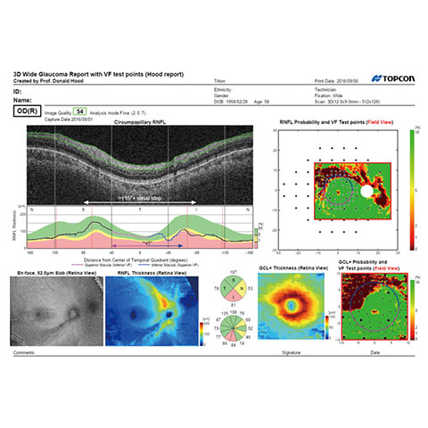 OCTと呼ばれる3次元光干渉断層画像解析を用いて、肉眼では見ることの出来ない網膜の内部を3D状に画像化する検査です。特殊な光を網膜に照射し、光の吸収と反射の状態から、表面観察ではわからない内部構造を3次元的に解析し、網膜に垂直な方向での断層画像や3Dマッピングによって視覚的に異常を調べることができます。網膜の内部構造は複雑な層状になっており、脳から繋がる光を感じるための視神経が網膜全域に張り巡らされ、複数種の神経細胞が網膜の層構造を構成しています。マッピングの検査では、主に網膜に張り巡らされた視神経の根本である視神経乳頭(脳から伸びた視神経の束が網膜とつながる場所)の3D構造状態の解析と、黄斑部(網膜で視野の真ん中を担う最も重要な領域)全体の層の厚みの解析描写をします。視神経の代表的な病気である緑内障は、視神経が眼圧によってダメージを受けて徐々に減っていくことで起こりますが、視神経が減ると視神経乳頭の神経の束が細くなり、視神経乳頭の凹みが大きくなります。これを、視神経乳頭陥凹拡大と言います。また、黄斑部の層の菲薄化(厚みが薄くなる)が進みます。視神経乳頭陥凹拡大や黄斑部の菲薄化は、イコール緑内障ではありませんが、緑内障の前段階として考えられる場合も多く、眼圧検査、視野検査等と併せて複合的な判断に利用されます。