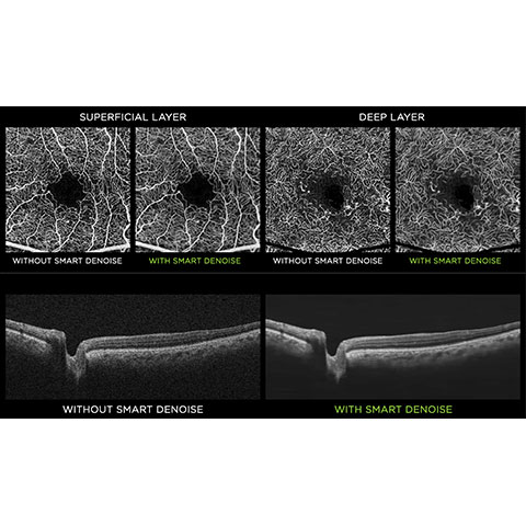 OCTアンギオグラフィーと呼ばれる最新の技術で、3次元光干渉断層画像解析を用いて、網膜の血管を描写します。実際に血管を直接撮影する眼底カメラとは違い、3次元光干渉断層画像解析で得られた網膜及び脈絡膜(網膜の外側にある膜)の内側の極短時間における複数枚の描写画像を比較し、“変化のない箇所”を削除することで、赤血球が常時動いている血管(動きのある個所)だけを残して描写する技術です(結果的に、血液の動きがある血管のみが描写されます)。今までは、血管の観察をするために、蛍光眼底造影と呼ばれる血管に造影剤(特殊な光で蛍光に発色する材料)を点滴で流して血管を光らせて撮影をする方法がとられてきました。しかし、造影剤を用いた蛍光眼底造影は、造影剤を血管に投与するため、造影剤のアレルギーや腎臓への負担、副作用があり、身体の負担と危険の大きい検査です。OCTアンギオグラフィーは造影剤を使用せず、極短時間で済む非常に負担の少ない検査で、高精度な眼底カメラ検査の結果と併せることで、血管状態を詳細に確認することが出来るため、眼病に限らず全身性の病気を発見する手がかりにもなっています。